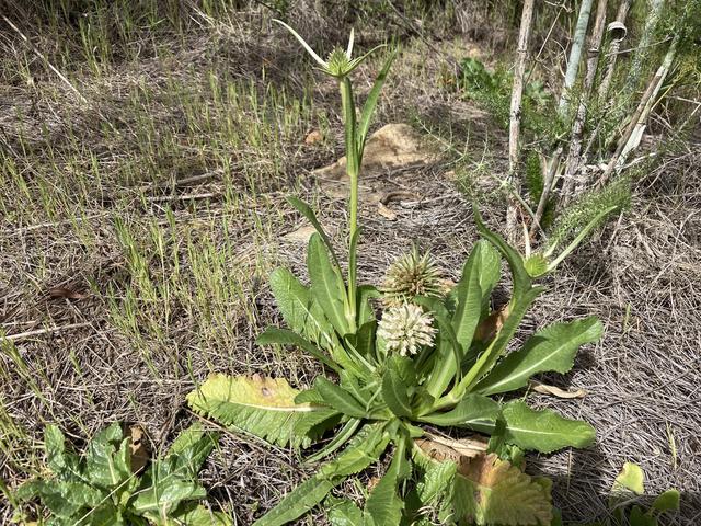 Dipsacus sativus is a biennial (family Dipsacaceae) found in California’s Coastal and Peninsular Ranges . It favors disturbed sites, including grasslands, roadsides, ditches and riparian sites. Fullers teasel’s spiny flower heads were used for carding wool before metal carding combs were created. Teasel plants may grow to form dense stands that are impenetrable by humans and animals. Teasel seeds can survive in the soil for 6 years or more, and once a dense population is established, it can persist for decades. Small populations may be mechanically controlled by removing plants to a few inches below the root crown. (source: Cal IPC) Image Below Left Dry Fruit, Image Lower Right Green Hairy Leaves, White Flower and Fruit (Photo Credit: Hiking San Diego) This section of Bancroft Creek has many 1000's of Fuller's Teasel Plants with the spiny fruit and stored seed. Removal of Fuller's Teasel and many other Invasive Plants is underway in Bancroft Creek and on Dictionary Hill Open Space Preserve . Please contact DHOSA(HomePage) for Volunteer invasive plant removal projects.
