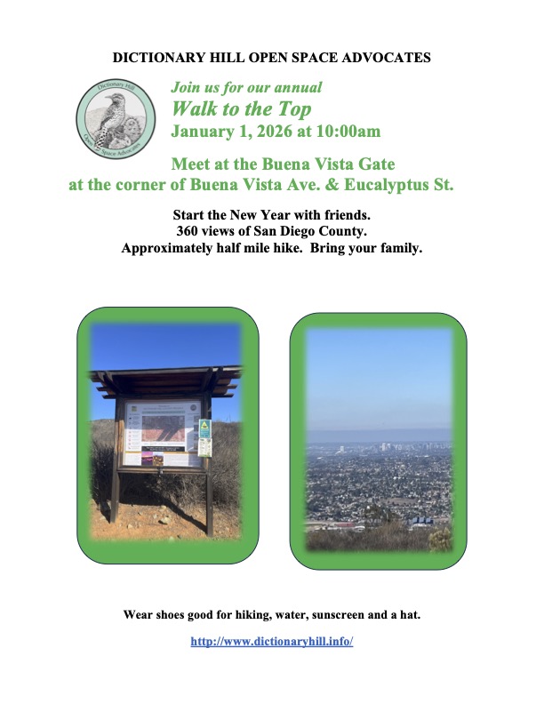 Dictionary Hill, originally known as Lookout Mountain, is a noted historical site. More than 150 years ago, Rufus King Porter, of of the founders of Spring Valley, climbed the mountain to see if the steamer had arrived before making the trip into Old Town to pick up mail and sell his produce. Today, from the top of Dictionary Hill, it is still possible to watch ships entering San Diego Bay. Let's save this wonderful experience for our children.